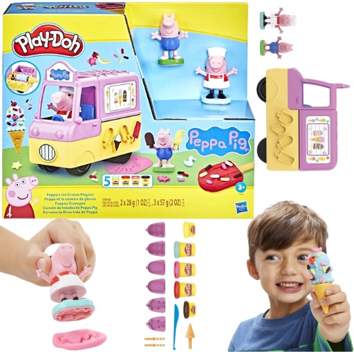 ➡️ Zestaw zawiera furgonetkę z lodami, 3 foremki, 2 figurki, 2 patyczki do lizaków lodowych, rożek lodowy, plastikowy nóż i 5 pojemników z masą plastyczną Play-Doh (łączna waga netto 226 gramów).