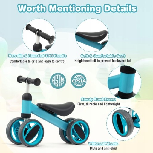 Nasz uroczy rowerek biegowy będzie wspaniałym prezentem dla maluchów w wieku 1-2 lat. Ten dziecięcy rowerek biegowy ma 4 koła i solidną stalową ramę, która jest stabilna i lekka do przenoszenia. A koła są wykonane z materiałów PP i EVA, dzięki czemu są odporne na zużycie i ciche do użytku wewnątrz i na zewnątrz. Biorąc pod uwagę bezpieczeństwo, rower został zaprojektowany z ograniczeniem skrętu do 135°, aby chronić rower przed wywróceniem się, szczególnie podczas skręcania. Ponadto uchwyt jest wyposażony w antypoślizgowe tekstury, a miękkie siedzisko zapewnia wygodę podczas długiego siedzenia. Dzięki instrukcjom i akcesoriom montaż jest łatwy i szybki.