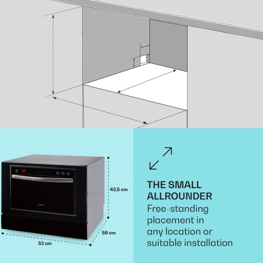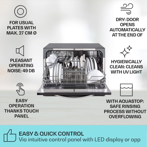 Zmywarka do naczyń Havasia UV 6 Luminance marki Klarstein to przekonująca pomoc w czyszczeniu z wieloma przydatnymi funkcjami! Wewnątrz znajduje się miejsce na maksymalnie 6 kompletów naczyń. Dzięki mocy 1380 W i siedmiu różnym programom Havasia UV 6 Luminance sprawia, że brudne naczynia znów błyszczą. Wszystkie programy można szybko i łatwo ustawić za pomocą dotykowego panelu sterowania. Z automatycznym otwieraniem drzwi i zintegrowaną lampą UV dla szczególnie efektywnego czyszczenia niezawodnie ułatwia codzienne życie. Havasia UV 6 Luminance może być stosowana jako urządzenie do zabudowy lub zmywarka stołowa. Jej elegancki design wprowadza także odrobinę luksusu do każdej kuchni.