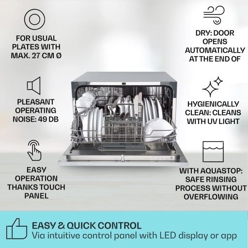 Zmywarka do naczyń Havasia UV 6 Luminance marki Klarstein to przekonująca pomoc w czyszczeniu z wieloma przydatnymi funkcjami! Wewnątrz znajduje się miejsce na maksymalnie 6 kompletów naczyń. Dzięki mocy 1380 W i siedmiu różnym programom Havasia UV 6 Luminance sprawia, że brudne naczynia znów błyszczą. Wszystkie programy można szybko i łatwo ustawić za pomocą dotykowego panelu sterowania. Z automatycznym otwieraniem drzwi i zintegrowaną lampą UV dla szczególnie efektywnego czyszczenia niezawodnie ułatwia codzienne życie. Havasia UV 6 Luminance może być stosowana jako urządzenie do zabudowy lub zmywarka stołowa. Jej elegancki design wprowadza także odrobinę luksusu do każdej kuchni.