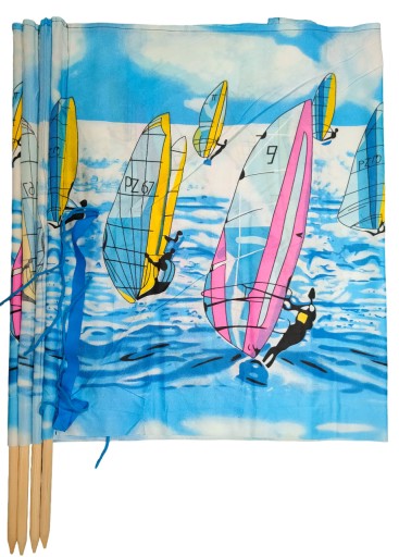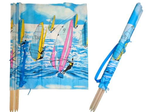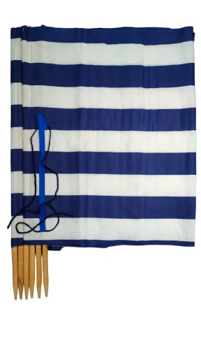 - Tkanina w naszych parawanach nie jest zaszywana od góry - zapobiega to przetarciom tkaniny podczas wbijania w piasek. Elementem dzięki któremu kijki zawsze trzymają się na swoim miejscu są spinki metalowe, które mocują materiał bezpośrednio do kijka.
