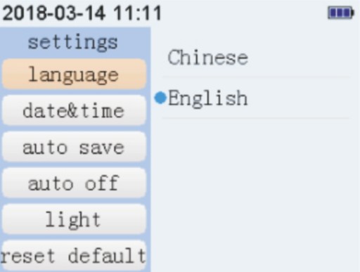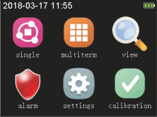 Z poziomu menu głównego można uruchomić tryb pomiaru pojedynczego lub wielu jednoczesnych pomiarów, wejść do przeglądu danych, wejść w ustawienia progów alarmowych, włączyć ustawienia i wejść do trybu kalibracji (tylko dla zaawansowanych)