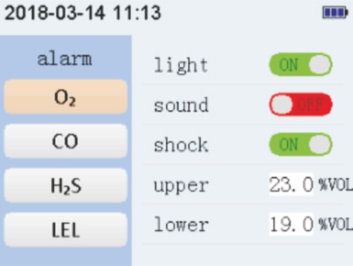 Dla każdego z gazów, możliwe jestosobne ustawienie parametrów alarmu.