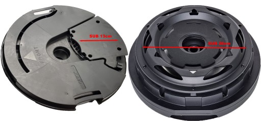 Poniżej: porównanie- plastikowy subwoofer z "systemów premium" z Audi/VW/Skody tu akurat Skoda Superb III z systemem "Canton". 13cm malutki głośnik i plastikowa kasta, razem waży to mniej niż 1,5kg. Sub Audio System SW11 ACTIV ok. 8,5kG, aluminiowy odlew, głośnik śr. 28cm!
