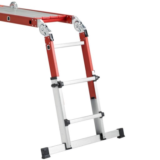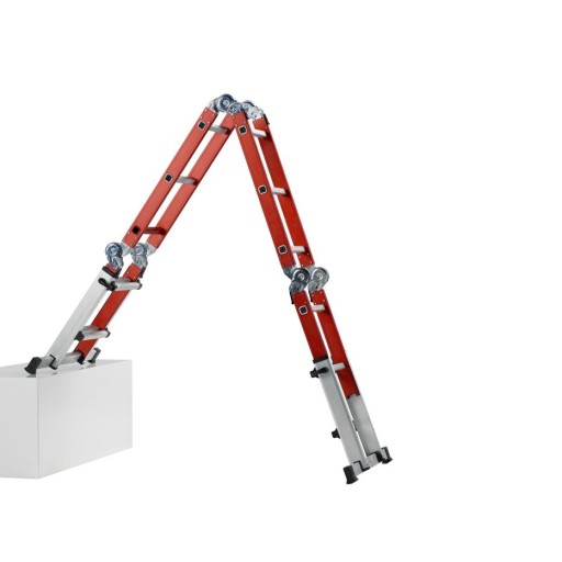 - Możliwość używania drabiny w kilku pozycjach: pozycji "A" ,w pozycji przystawnej, w pozycji jako podest roboczy lub z dystansem od ściany. Idealna również do nierównych powierzchni.