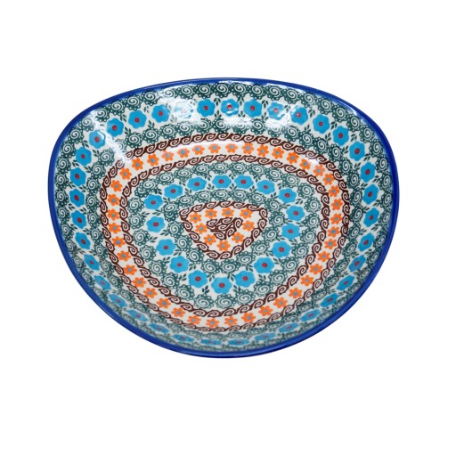 Oryginalny produkt ceramiki bolesławieckiej - miska ceramiczna Nina o szerokości 28 cm i pojemności 1200 ml. Ręcznie zdobiona kamionkowa misa o nie regularnym kształcie, idealna do podawania i przechowywania potraw. Niech Twoja potrawa przygotowana będzie podana pięknie i smakuje wykwitnie dzięki artystycznym naczyniom ceramiki Bolesławieckiej z rodzinnej manufaktury, CERAMIKA ANDY, ręcznie zdobionym podszkliwnie.