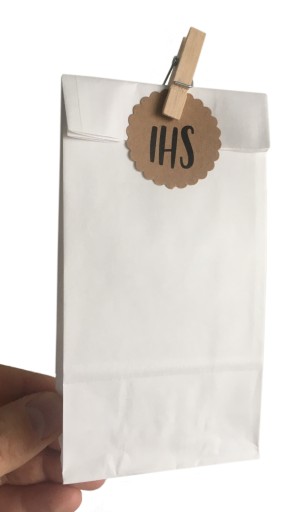 Torebka papierowa - z papieru białego - bilecik z eko papieru przypinany klamerką