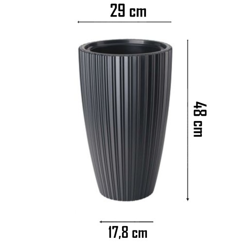 Doniczka Mika Slim to wyśmienity wybór dla większości roślin. Jej ponadprzeciętny wzór, wykonanie kształtu formy oraz dołączony do kompletu wkład sprawia, że sprawdzi się w większości pomieszczeń oraz na balkonie, tarasie, ogrodzie. Doniczka ta posiada wewnętrzny, wyjmowany wkład dzięki któremu przy sadzeniu rośliny używamy mniejszej ilości podłoża oraz jeśli we wkładzie wykona się otwory, nadmiar wody będzie mógł swobodnie odpłynąć do pozostałej części donicy. Dla wszystkich ceniących ekologię, dodatkowym atutem jest fakt, że do jej produkcji wykorzystano wyselekcjonowany plastik w 80% pochodzący z recyklingu. Dzięki temu doniczka ta posiada naturalny, niepowtarzany wzór i EKO charakter.