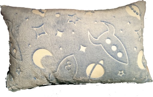Poduszka wykonana z miękkiego i miłego w dotyku pluszu, który po naświetleniu posiada właściwość świecenia w ciemności.