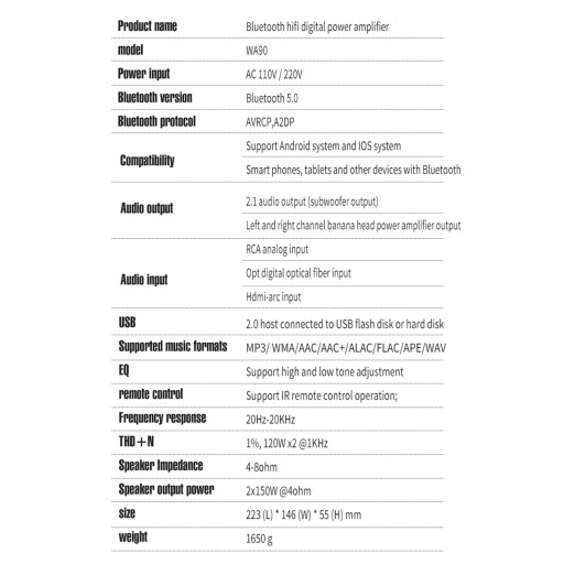WA90 to wsparcie cyfrowego wzmacniacza HIFI o dużym, który integruje karaoke z dyskiem Bluetooth jednym, z bardzo bogatymi interfejsami