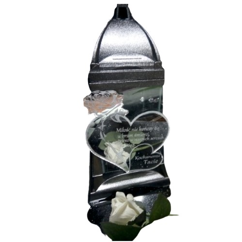 Niesamowity wygląd na zdjęciach można zobaczyć jak odbija się leżąca róża przed zniczem na sercu z grawerem na zniczu zniczu
