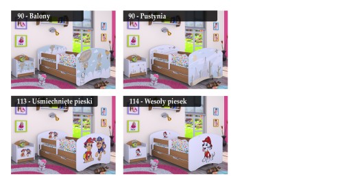 Każdy z mebli może być wykonany z motywami dostępnymi na łóżeczkach.