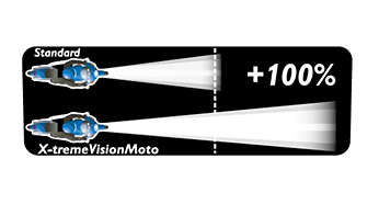 Nawet o 100% więcej światła. W celu uzyskania lepszego poziomu wydajności i bezpieczeństwa żarówki Philips X-tremeVision Moto zostały opracowane z wykorzystaniem najnowocześniejszej technologii, dzięki czemu emitują o 100% więcej światła — pomaga to kierowcom potrzebującym widoczności na większą odległość.