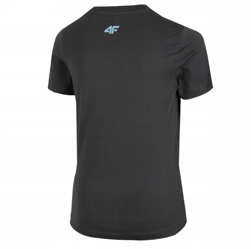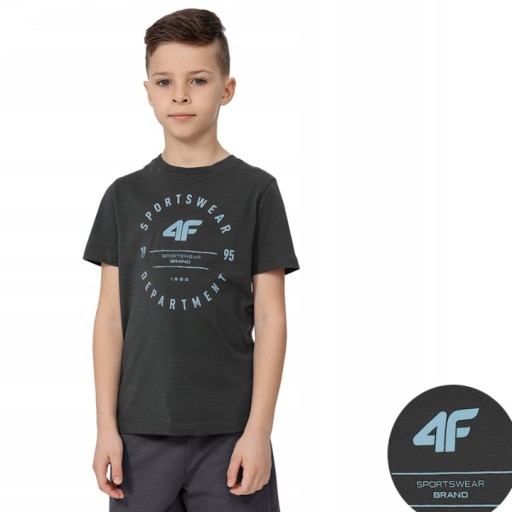Koszulka chłopięca 4F z krótkim rękawem, z dużym logiem z przodu i napisami, oraz małym logiem z tyłu. W kolorze producenta - ANTRACYT.