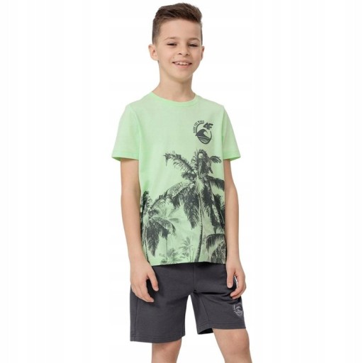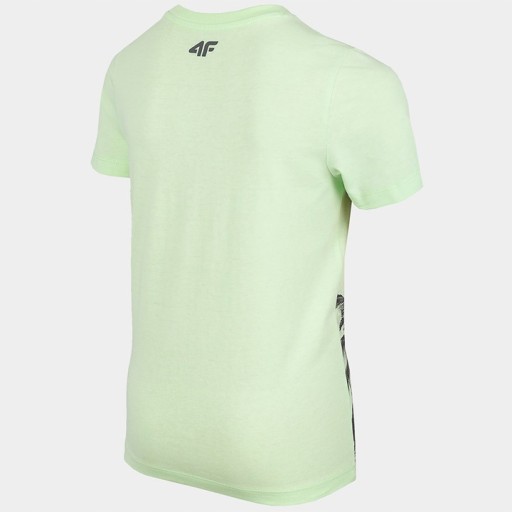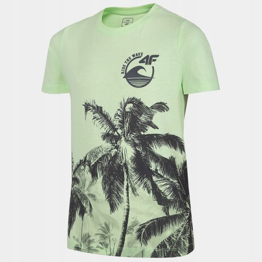 Koszulka chłopięca 4F z krótkim rękawem, z dużym wakacyjnym nadrukiem w palmy z przodu i małym logiem, oraz małym logiem z tyłu. W kolorze producenta - LIMONKA.