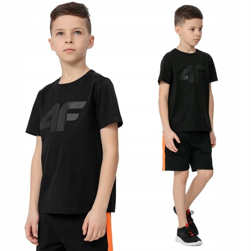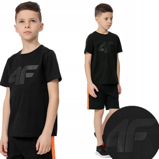 Koszulka chłopięca 4F z krótkim rękawem, z dużym logiem z przodu i małym logiem z tyłu.