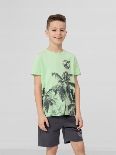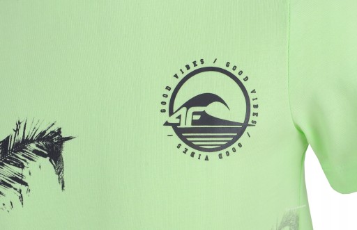 Koszulka chłopięca 4F z krótkim rękawem, z dużym wakacyjnym nadrukiem w palmy z przodu i małym logiem, oraz małym logiem z tyłu. W kolorze producenta - LIMONKA.