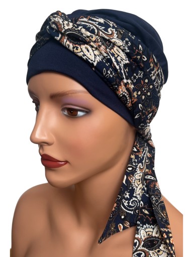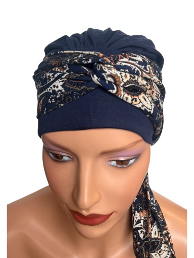 Turban Lena to gotowa do założenia czapka z doszytą szarfą z tyłu czapki , którą można użyć do różnych kompozycji .
