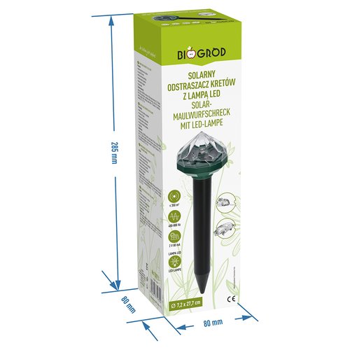 Odstraszacz ten to nowoczesne urządzenie służące do skutecznego, humanitarnego oraz bezkontaktowego odstraszania kretów i innych gryzoni. Emituje fale ultradźwiękowe w zakresie 400-800 Hz, które są jedynie lekko słyszalne dla człowieka. Jest bezwonny i całkowicie bezpieczny dla ludzi oraz zwierząt, nie zakłóca działania urządzeń elektrycznych. Tworzy niewidzialną barierę na obszarze 350 m2 (w przestrzeni nie ograniczonej przeszkodami). Wysoce skuteczny - różna częstotliwość dźwięków generowanych w nierównych odstępach czasu zapobiega przyzwyczajeniu się szkodników do emitowanego sygnału i gwarantuje ich odstraszanie.