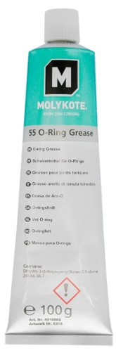 MOLYKOTE® 55 O-RING. Białawy silikonowy o szerokim zakresie temperatur smar do oringów, gumy, statycznych i ruchomych urządzeń i uszczelnień gumowych. Podstawowy skład to olej silikonowy, estry, mydło litowe jako zagęszczacz, inhibitory korozji i przyczepności zapewnia produktowi doskonałą odporność na utlenianie, dobra ochrona przed korozją, szeroki zakres temperatur (-65 °C do 175 °C) oraz kompatybilność z wieloma tworzywami sztucznymi, elastomerami a także możliwość smarowania powierzchni które są mokre, wytrzymałość a ścinanie w niskich temperaturach oraz łatwy montaż i demontaż oraz doszczelnienie posmarowanych DC 55 częsci uszczelniających. Doszczelnienie np. oringu następuje na wskutek tego ,że oring posmarowany produktem Dow 55 ulega tzw. Obrzękowi, dlatego też często smar zwany jest jako smar do oringów. Ciekawsze aplikacje w których smar doskonale spełnił swoje zadania to: smarowanie armatury i rurociągów w przemyśle ciężkim i chemicznym w tym przy przesyłaniu ropy i gazu, smarowanie broni pneumatycznej, pompy i sprężarki w przemyśle chemicznym i petrochemicznym, w przemyśle tworzyw sztucznych w maszynach do formowania i tłoczenia. Ponadto smar Molykote 55 szeroko stosowany jest przez producentów napędów pneumatycznych i hydraulicznych robotów i siłowników, obrabiarek, narzędzi, przyrządów, wymienników ciepła i podzespołach instalacji gazowych. Smar Molykote 55 ze względu na bardzo dobre właściwości w niskich temperaturach powszechnie używany jest przez wyprawy naukowe na tereny podbiegunowe.
