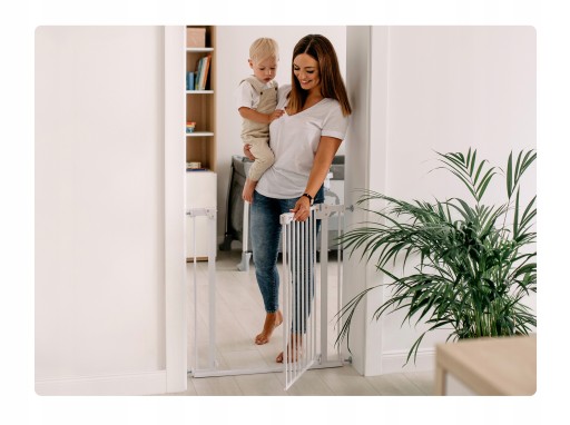 Szeroki zakres od 75 do 85 cm pasuje do większości standardowych framug. Specjalna nakładka umożliwia przedłużenie barierki aż do 105 cm. Po dołożeniu dodatkowego rozszerzenia bramkę można stosować również w celu zabezpieczenia schodów.