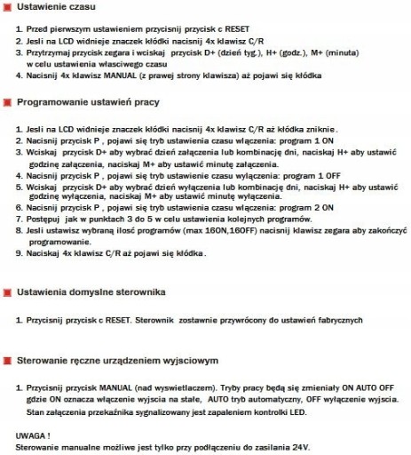 Cyfrowy sterownik czasowy na napięcie 24V AC/DC posiada szerokie zastosowanie do sterowania oświetleniem LED lub innymi urządzeniami wymagającymi określonego czasu pracy lub wybranych godzin załączania i wyłączania, np. klimatyzatorów, reklam świetlnych, kuchenek elektrycznych, opryskiwaczem w ogrodzie, urządzeniami nadawczo odbiorczymi, w maszynach, itp. Umożliwia zaprogramowanie działania dla 7 dni tygodnia. Sterownik posiada 16 programów a jego programowanie jest bardzo proste i intuicyjne. Każdy z dostępnych programów można ustawić niezależenie w które dni ma być dany program aktywny. Dodatkowo można ustawić kilka różnych programów na wymagany dzień lub dni. Sterownik posiada wiele różnych możliwości konfiguracji a w razie potrzeby można przejść na sterowanie ręczne przyciskiem MANUAL. Zapalona czerwona dioda sygnalizuje stan pracy załączenia przekaźnika (obwód wyjścia sterowania)