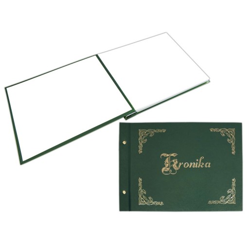 Kronika, księga pamiątkowa, księga gości, czy wpisów a także księga ślubna lub kondolencyjna a ogólnie mówiąc pamiątkowa, zawsze wykładana jest podczas uroczystych okazji. Im ważniejsza osoba czy wydarzenie tym bardziej okazała powinna być kronika. Elegancka, ręcznie i estetycznie wykonana kronika WARTA. Grzbiet mocowany za pomocą mosiężnych śrub. Solidna, twarda okładka oprawiona okleiną wykonaną z PVC, na której umieszczony został efektowny napis i złocone zdobienia.