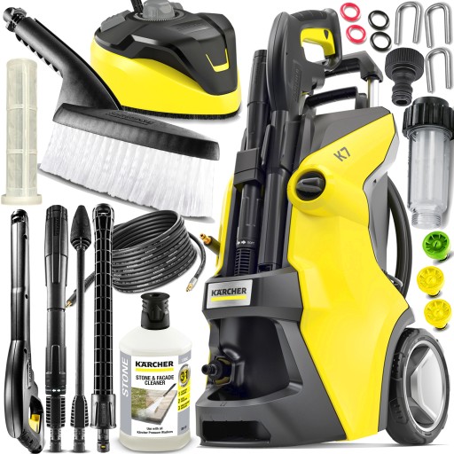z przystawką do szybkiego i efektywnego czyszczenia powierzchni płaskich T-Racer T 7 oraz lancami Vario Power, oraz rotacyjną firmy Karcher