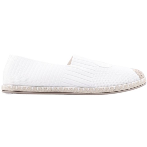 Espadryle damskie wsuwane, z niską cholewką przed kostkę. Osadzone na płaskiej podeszwie otoczonej plecionką z juty. Wykonane z materiału tekstylnego. Nosek dodatkowo wzmocniony wstawką z plecionki. Wkładka wykonana z ekoskóry.