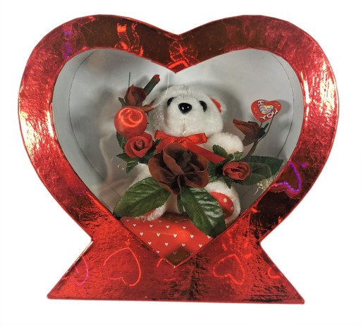 Biały miś z różami. W pudełku w kształcie serca.