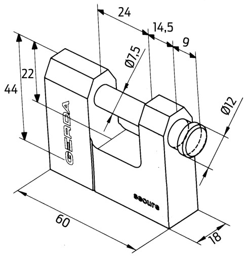 Specyfikacja kłódki Gerda KSWT T60: 3 klucze w komplecie średnica pałąka - 8 mm szerokość korpusu - 60 mm wysokość korpusu - 44 mm grubość korpusu - 18 mm wysokość przestrzeni pod pałąkiem - 12 mm szerokość przestrzeni pod pałąkiem - 24 mm