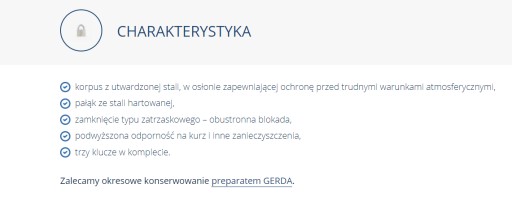 Główne cechy: korpus jest z utwardzanej stali w osłonie, która zapewnia ochronę przed trudnymi warunkami atmosferycznymi wydłużony pałąk ze stali hartowanej zamknięcie typu zatrzaskowego – obustronna blokada podwyższona odporność na zanieczyszczenia oraz kurz posiada zaślepkę, która chroni mechanizm zamykania 3 klucze w komplecie