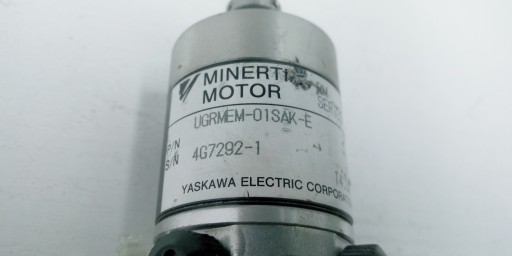 Silnik marki Yaskawa - Minertia Motor, model UGRMEM-01SAK-E. Dla zasilania napięciem stałym 24V DC, obroty na wyjściu wynoszą 4900rpm - mierzone bez obciążenia, wałek wyjściowy z przodu fi6x14mm, wałek wyjściowy z tyłu fi5x11mm, przetestowany w pełni sprawny. Silnik nieużywany, pochodzi z zapasów magazynowych
