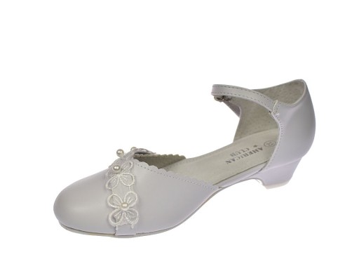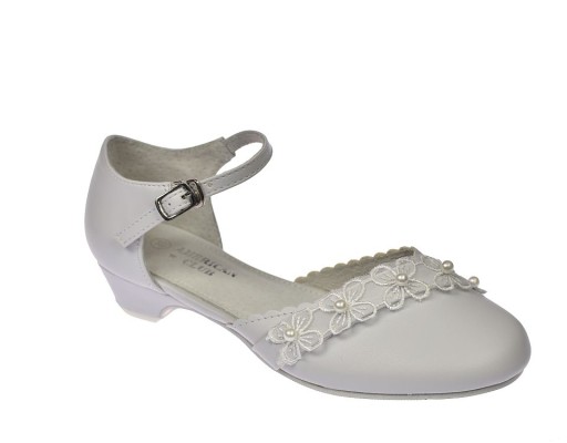 Buty komunijne białe balerinki dziewczęce białe na obcasie zapinane na pasek marki American Club