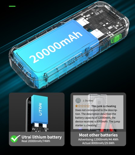 silnik samochodowy. Pojemność 20 000 mAh. Maksymalny prąd szczytowy - 3000 A. Uruchamia wszystkie silniki benzynowe do 10 litrów, silniki Diesla do 8 litrów. Nadaje się do samochodów osobowych, ciężarowych, motocykli, łodzi, małych jachtów. Wyjście USB do urządzeń zewnętrznych. Ekran LCD. Wbudowana latarka z 4 trybami pracy.