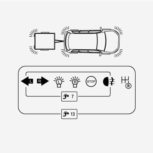 - Wykrywanie i komunikowanie uszkodzenia żarówki kierunkowskazu przyczepy