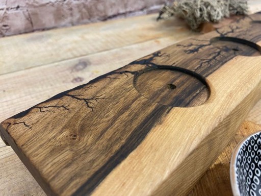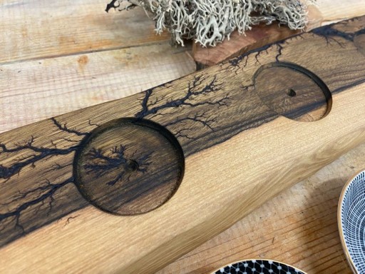 Deska wykonana z orzecha jest wypalana prądem, który tworzy niepowtarzalne wzory następnie opalana i zaimpregnowana olejem lnianym.