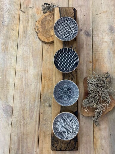 Zestaw czterech miseczek na sosy i dipy oraz drobne przekąski z drewnianą, ręcznie robioną podstawką.