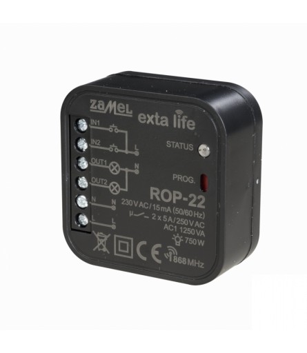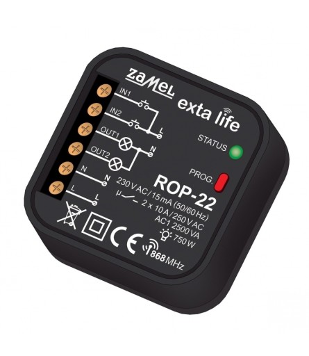 Radiowy odbiornik puszkowy ROP-22 to element końcowy systemu EXTA LIFE, który umożliwia sterowanie dowolnymi urządzeniami w domu lub biurze. Wyjście w postaci pojedynczego styku zwiernego daje możliwość sterowania obwodami niskonapięciowymi (na przykład 12/24 V AC/DC) oraz wysokonapięciowymi (230 V AC). ROP-22 sprawdza się także przy zdalnym wyzwalaniu innych urządzeń oraz przy podawaniu sygnałów sterujących. Odbiornik można także z powodzeniem wykorzystać do sterowania elektrozaworami w systemach ogrzewania. Aktualny stan urządzenia sterowanego poprzez ROP-22 wskazywany jest w aplikacji mobilnej dzięki komunikacji dwukierunkowej pomiędzy odbiornikiem a kontrolerem. Taki sposób komunikacji umożliwia także parametryzację odbiornika oraz zdalne dopisanie nadajników (bez fizycznego dostępu do odbiornika). Algorytm kodowania ramek zapewnia bezpieczeństwo sterowania. ROP-22 poza kontrolerem może być równolegle sterowany z poziomu nadajników systemu EXTA LIFE. Do odbiornika można wpisać większą liczbę nadajników co daje możliwość niezależnego sterowania z kilku miejsc. Urządzenie przeznaczone jest do montażu w puszkach instalacyjnych pod- i natynkowych. Dodatkowe, konfigurowalne wejścia przewodowe zwiększają funkcjonalność sterowania. Odbiornik posiada zaimplementowaną funkcję zdalnej aktualizacji oprogramowania z poziomu kontrolera.