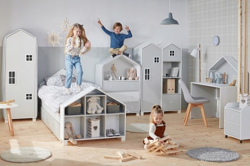 Te niesamowite meble-domki staną się placem zabaw w dziecięcym pokoju! Dzięki wyjątkowo mocnej, dwustronnie kolorowej płycie 16 mm, opatentowanym łączeniom, okuciom i włoskim zawiasom, pryzma przy daszkach wytrzymuje obciążenie nawet do 120 kg!