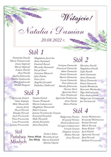Tablica powitalna z układem stołów na wesele / przyjęcie, wzór wrzos/lawenda
