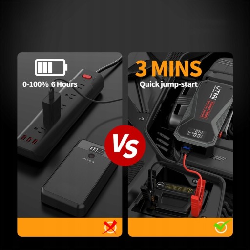 Przenośny rozrusznik samochodowy Jstar X1 nie wymaga wstępnego ładowania przez wiele godzin, 3-minutowe szybkie ładowanie, plug and play, naprawdę oszczędza Twój czas. Ponadto ten rozrusznik akumulatora samochodowego może być używany ponad 100 000 razy. Jest wygodniejszy i ma dłuższą żywotność niż inne zwykłe rozruszniki.