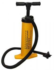 Uniwersalna pompka ręczna Aqua Marina AC-81050, posiadająca system pompowania i odpompowywania powietrza. Pompka podwójnie tłocząca, posiadająca szeroki uchwyt (21 cm) i stopki do przytrzymywania nogami. Długi wąż z czterema końcówkami umożliwia zastosowanie pompki do różnego rodzaju zaworów. Idealna do pompowania pontonów, materacy, basenów, kółek. System blokowania węża zapobiega odłączeniu go od pompki w czasie pompowania lub odpompowywania powietrza. Pompka jest wydajna, poręczna i łatwa w użyciu.