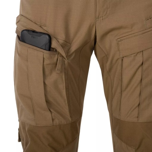 Ponadto w kluczowych miejscach (pas, krocze i tył kolan) zastosowano wstawki z rozciągliwego materiału Versastrech. Jego największą zaletą jest szybkie schnięcie i wysoka oddychalność. Dodatkowo, okolice kolan zostały wzmocnione Cordurą 500D, a w razie potrzeby są też kieszenie na wkładki ochronne. Dzięki ściągaczami pod kolanami i w dolnej części nogawki, spodnie łatwo dopasować.