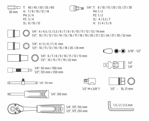 - nasadki sześciokątne 1/2" 17 szt.: 10, 11, 12, 13, 14, 15, 16, 17, 18, 19, 20, 21, 22, 24, 27, 30, 32 mm,