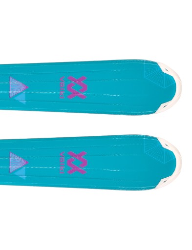 Narty Volkl Chicka zestawiono z wiązaniami Marker VMOTION 7.0, które montowane są na dodatkowej płycie szynowej pod wiązaniem. System montażu umożliwia regulację beznarzędziową rozstawu do butów narciarskich w zakresie 235 – 330 mm.