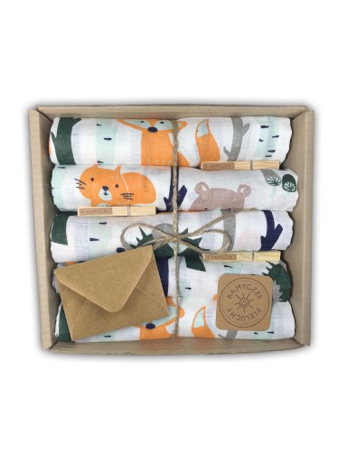 Komplet 5 sztuk najwyższej jakości pieluszek jest efektownie opakowany, gotowy do wręczenia jako prezent. W zestawie znajduje się również gratis w postaci firmowych klamerek.