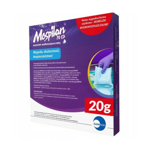 MOSPILAN 20 SP jest środkiem owadobójczym w formie proszku rozpuszczalnego w wodzie, o działaniu kontaktowym i żołądkowym, przeznaczony do zwalczania szkodników ssących i gryzących w uprawie ziemniaka, roślinach sadowniczych, warzywnych, ozdobnych. Środek MOSPILAN 20 SP stosowany jest przy użyciu opryskiwaczy ręcznych. Na roślinie działa powierzchniowo, wgłębnie i systemicznie.