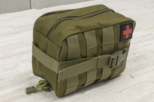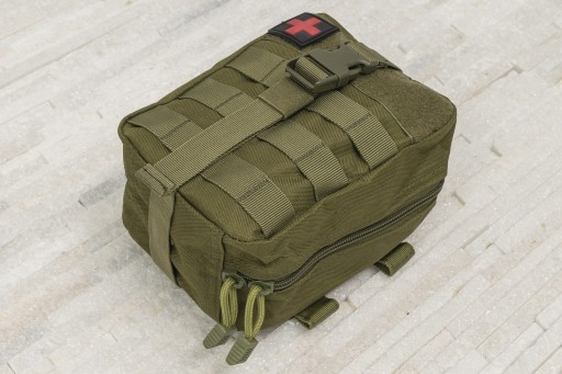Produkt wykonano z wytrzymałego materiału (Poliester 600D), odpornego na warunki atmosferyczne. Apteczka zamykana jest na zamek błyskawiczny. Znaczek czerwonego krzyża jest doczepiany za pomocą rzep i może być z łatwością zdjęty.