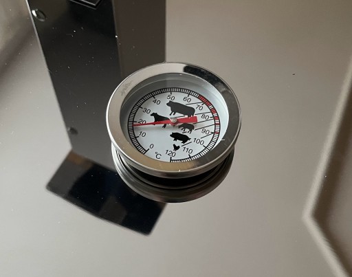 - Co ważne, na górze wędzarni zainstalowany jest termometr który pozwala kontrolować warunki wędzenia. Kolejne proste i niezawodne rozwiązanie.